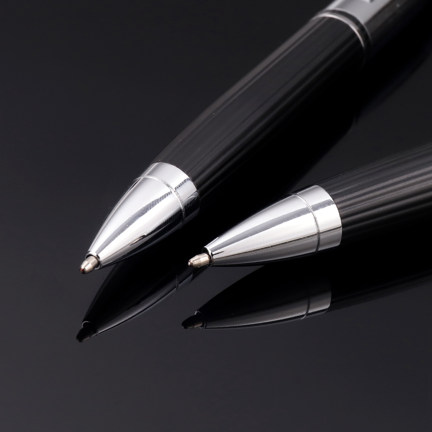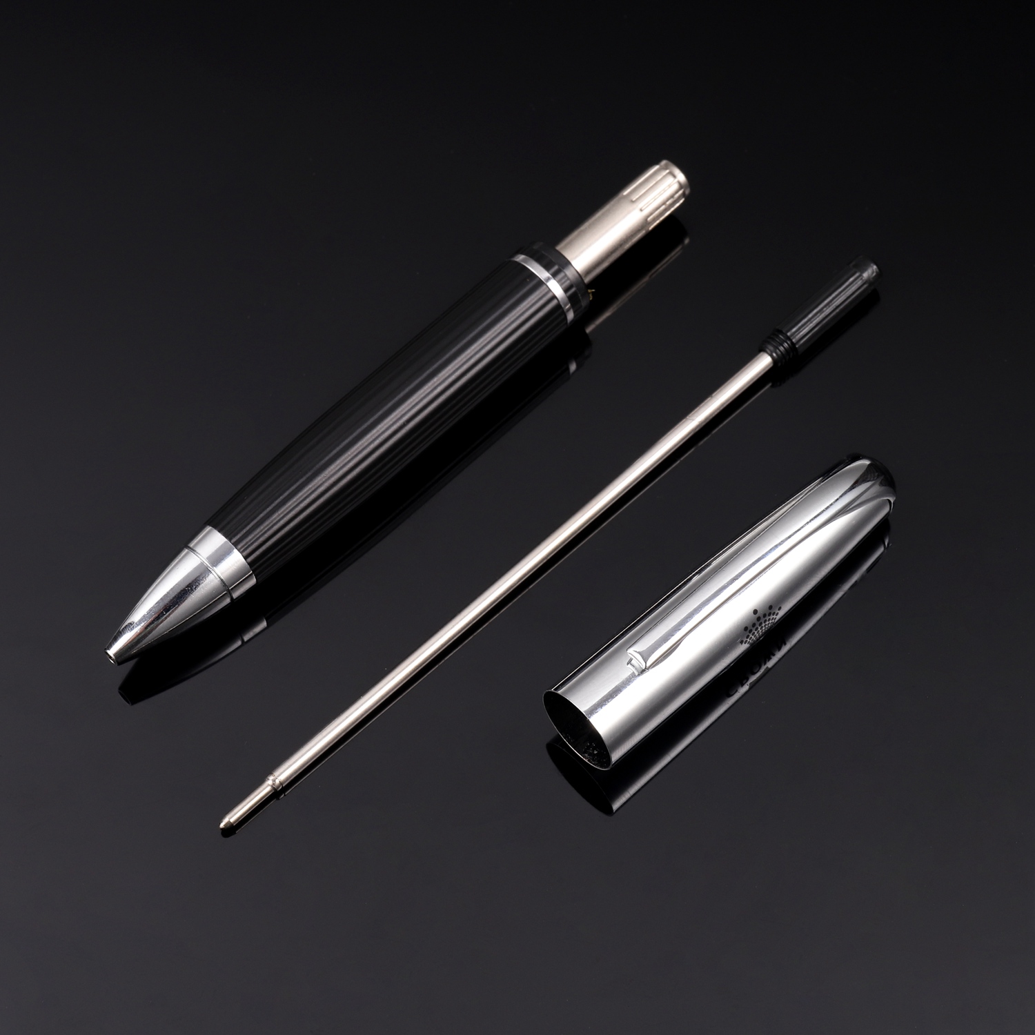This metal ballpoint pen features a linear textured barrel design that enhances grip and adds a refined industrial aesthetic. Combined with a polished chrome upper body, it creates a balanced look between professionalism and functionality.