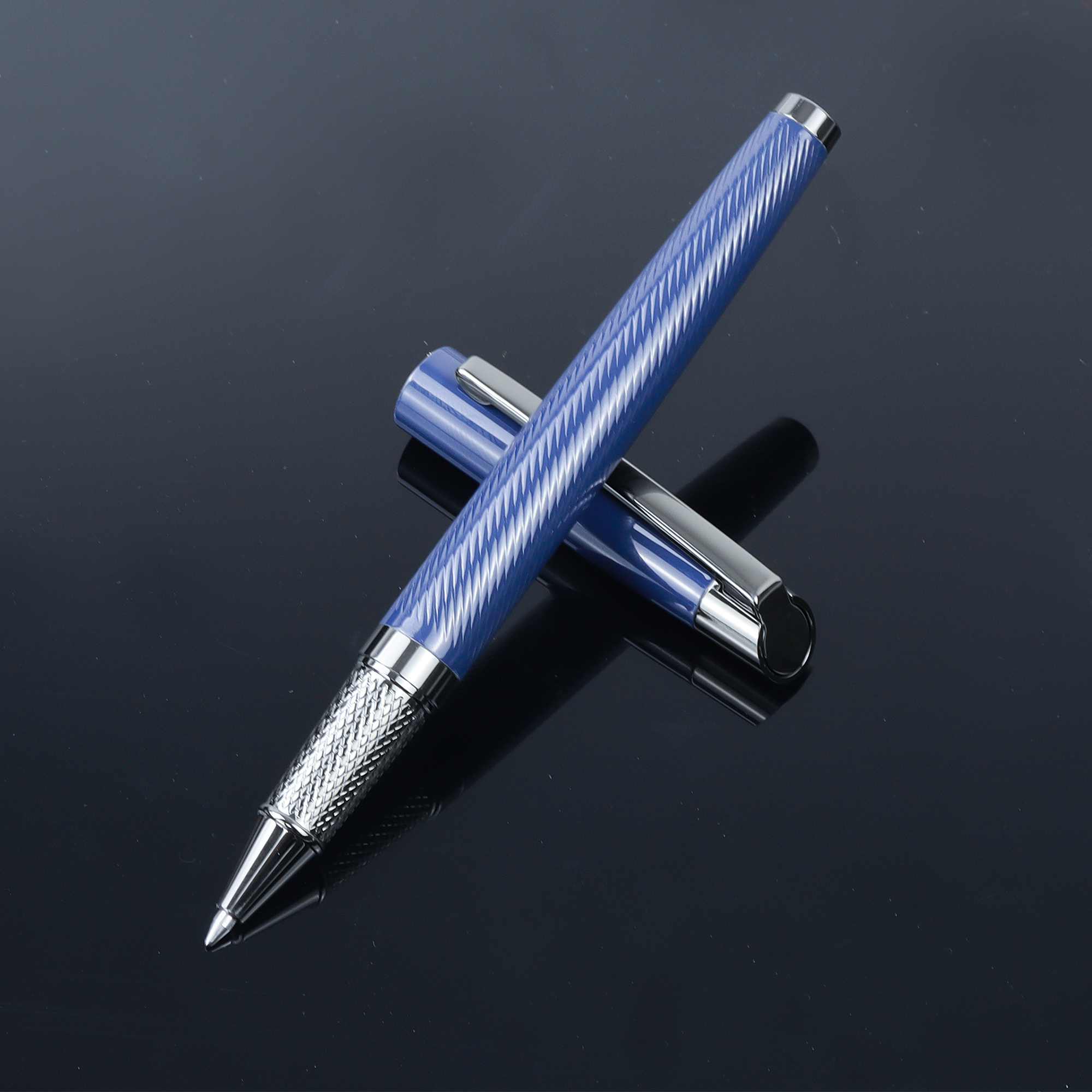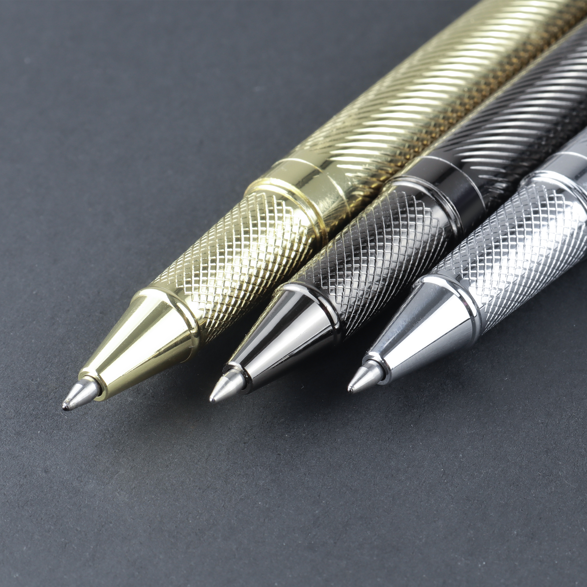 The textured surface enhances grip while adding a unique visual identity, making it stand out among standard business pens. Available in multiple finishes such as black, silver, gold, and blue, this pen fits various branding styles and corporate preferences.