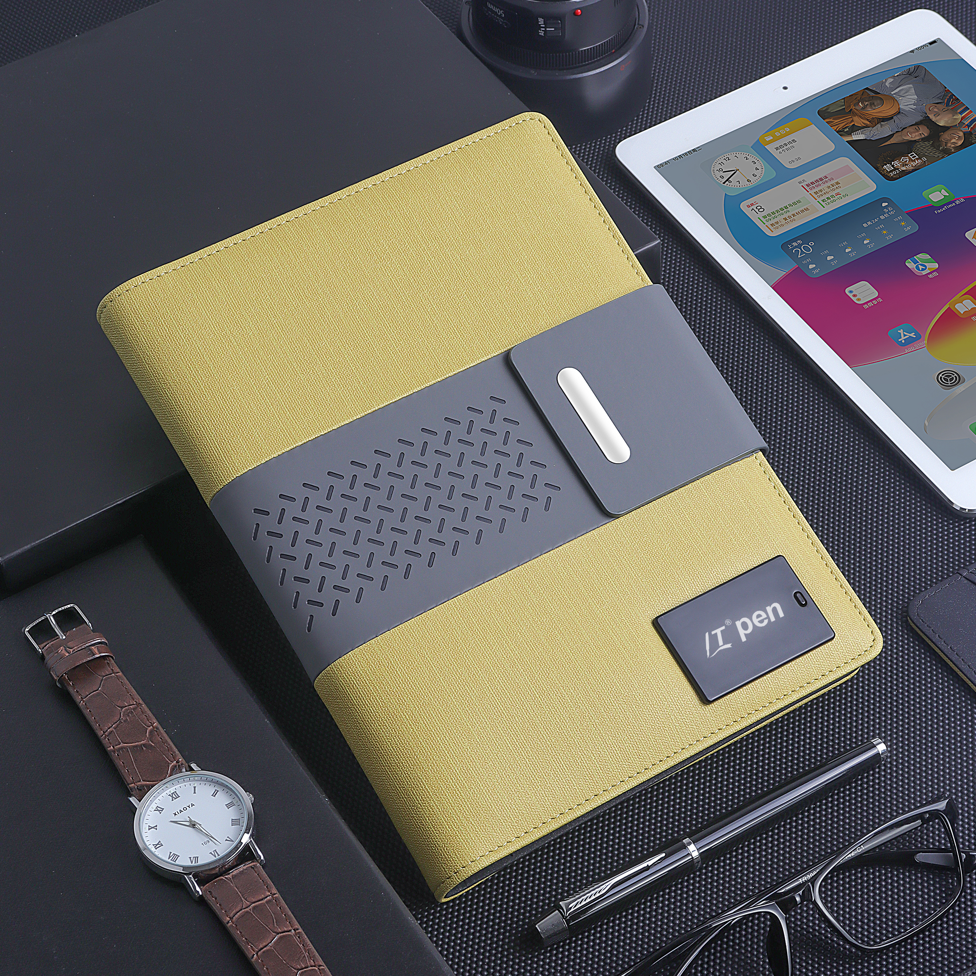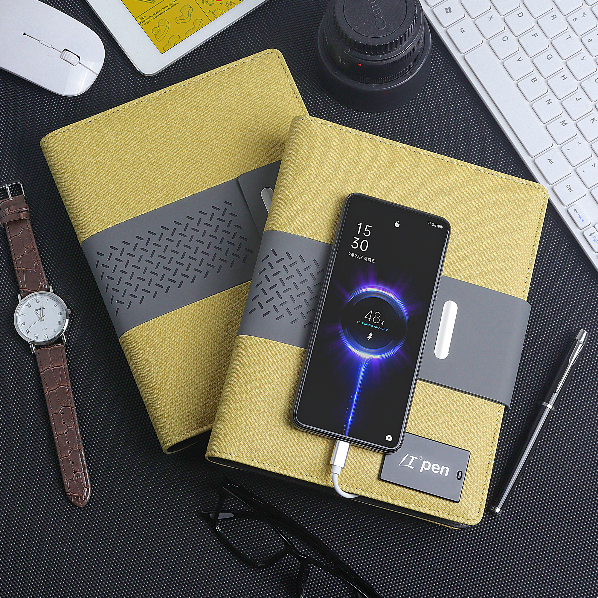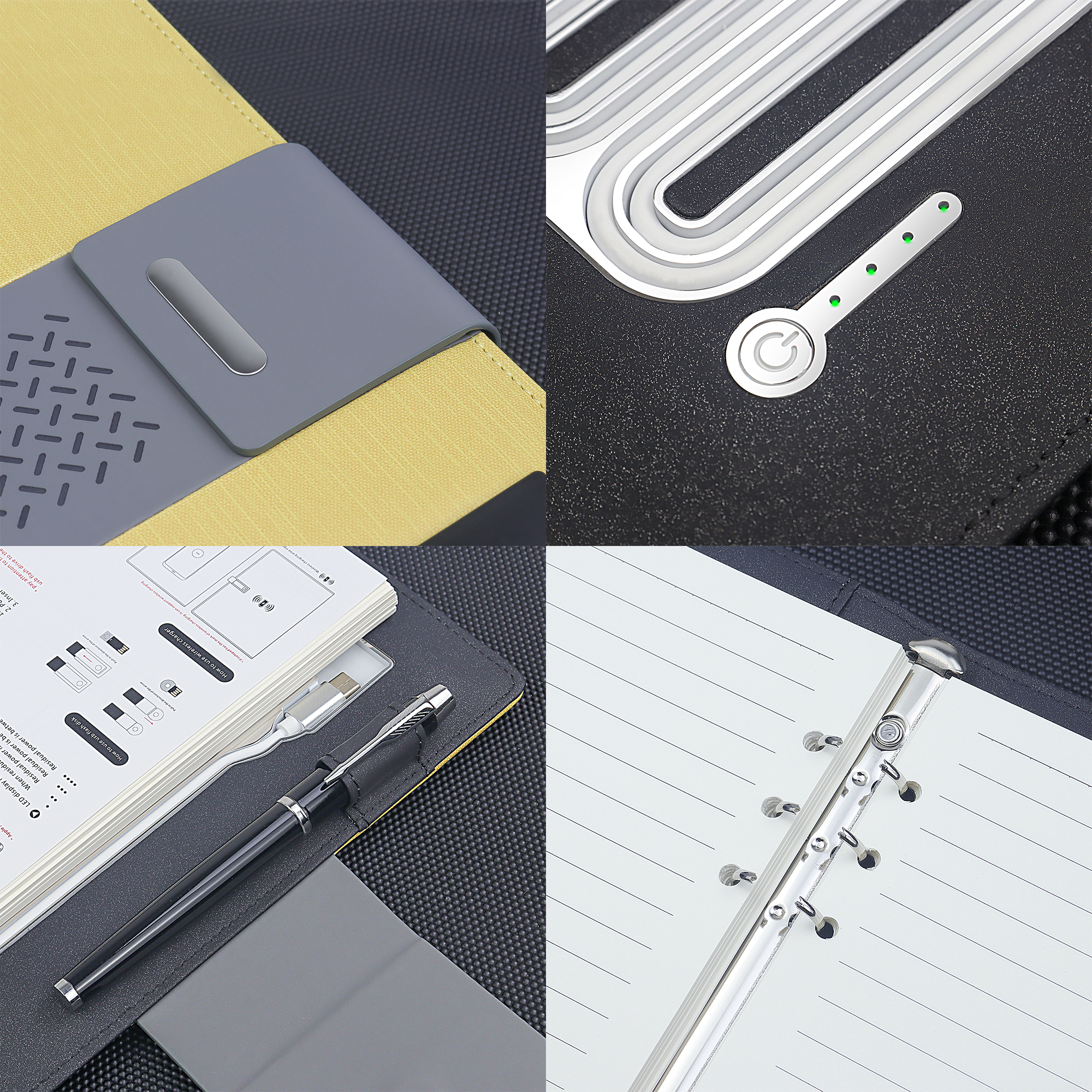 This magnetic charging notebook combines traditional writing functions with modern mobile charging needs. It features a built-in power bank and integrated charging cable, allowing users to conveniently charge mobile devices during meetings, travel or daily office work.