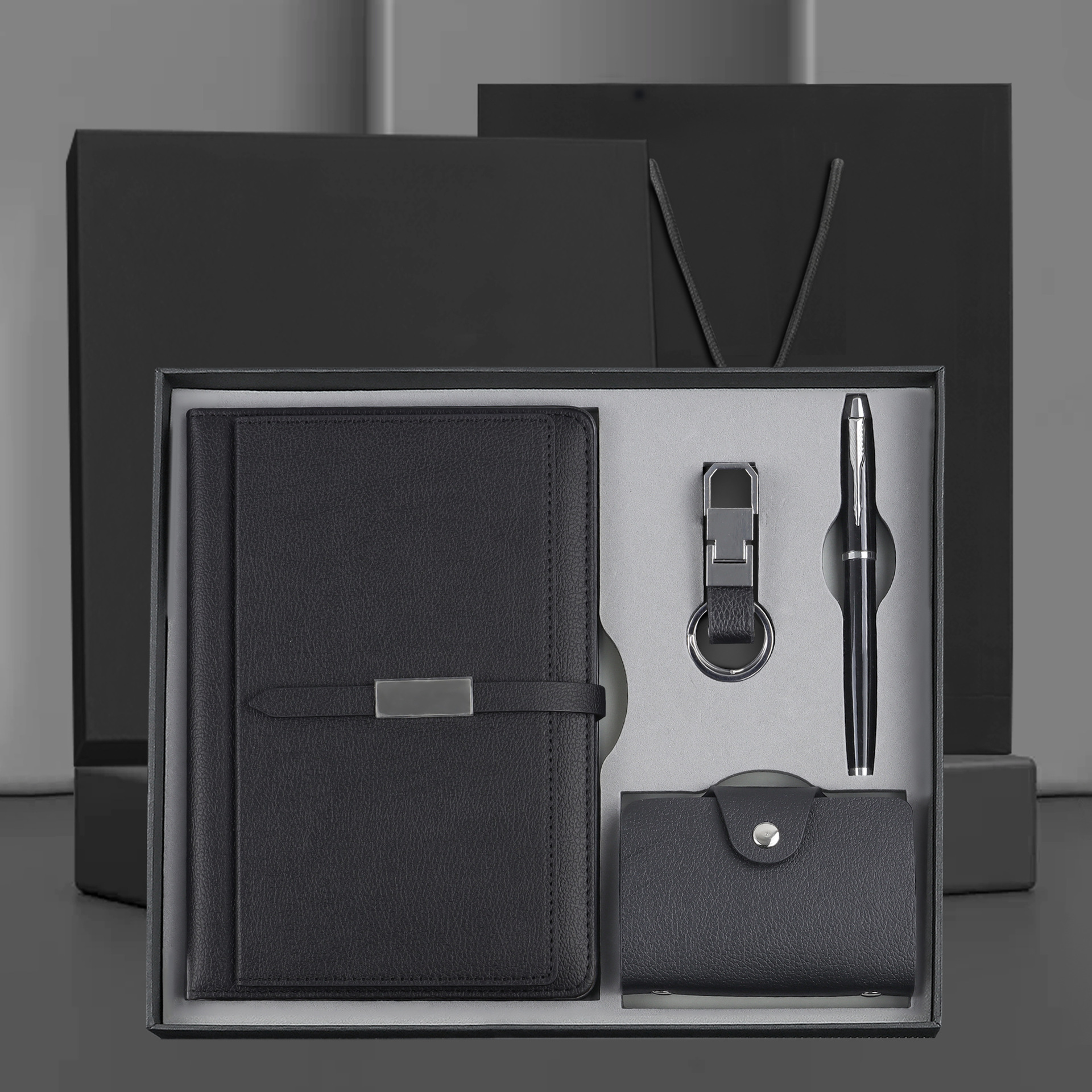 The set includes a PU leather notebook, matching PU leather wallet, metal ballpoint pen and metal keychain, offering both practicality and refined appearance.